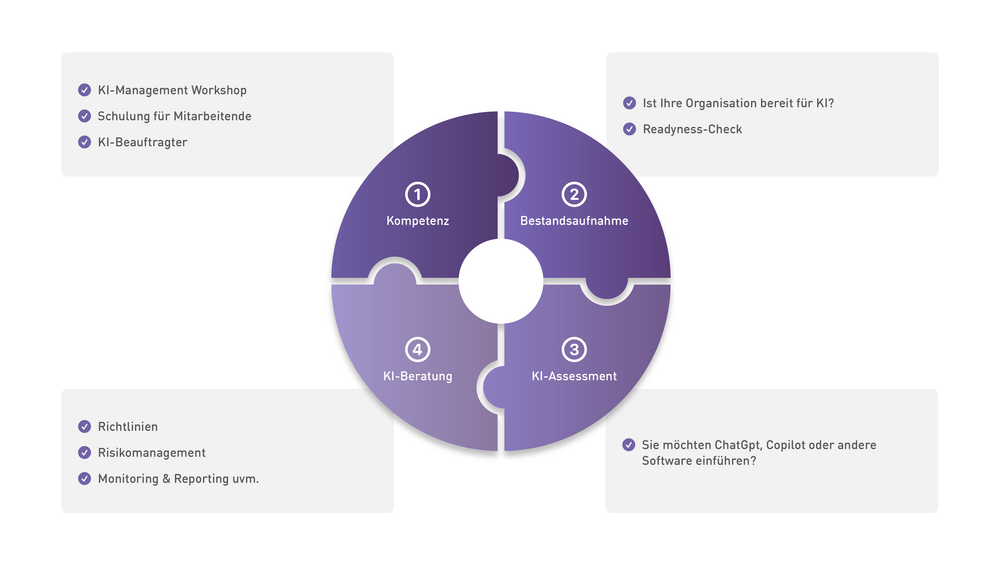 Egal, ob es sich um Unternehmen, öffentliche Organisationen oder Non-Profit-Organisationen handelt, der erfolgreiche Einsatz von Künstlicher Intelligenz stellt viele vor neue Herausforderungen. Besonders wichtig ist es, die KI-Lösungen so zu gestalten, dass sie sicher, ethisch und gesetzeskonform sind. Genau hier setzen wir mit unserer Beratung an.