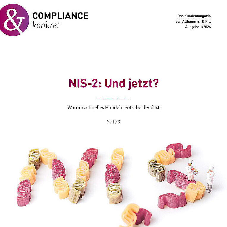 Datenschutz, Informationssicherheit, Künstliche Intelligenz und Compliance - wir geben einen Überblick über aktuelle Herausforderungen in der Branche und wie wir Sie dabei unterstützen können. Im "COMPLIANCE konkret" Magazin halten wir Sie auf dem Laufenden, geben Ihnen einen Blick hinter die Kulissen von Althammer & Kill und stellen Ihnen unser Team vor.